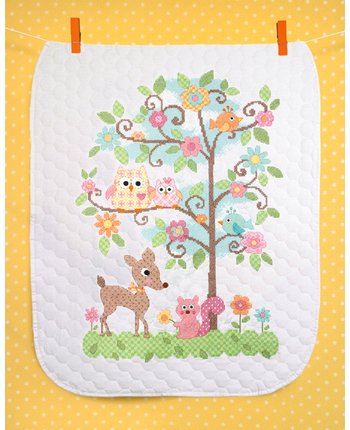 Happi Tree Quilt, Cute critters adorn Dimensions' Happi Tree Quilt in stamped cross stitch. A perfect addition to a baby's nursery! Finished Size: 34" x 43" (86 x 109 cm). Contains presorted cotton thread, design printed in wash-away ink on prefinished cotton/polyester quilt, needle and easy instructions. Design from Dena Designs, Inc.